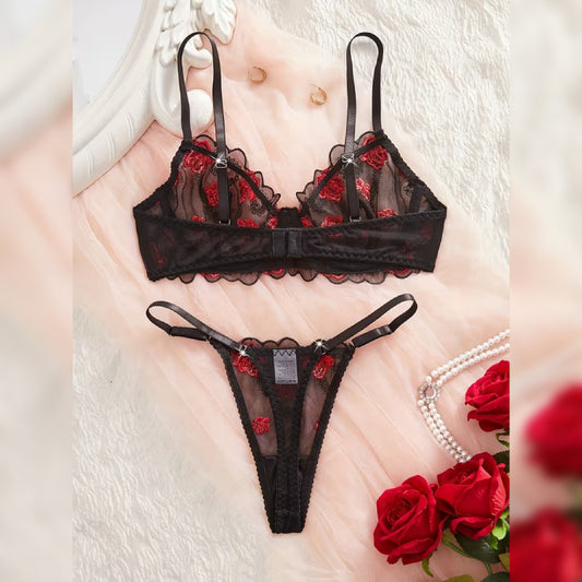 刺繍メッシュフラワーデザイン セクシーランジェリーセット