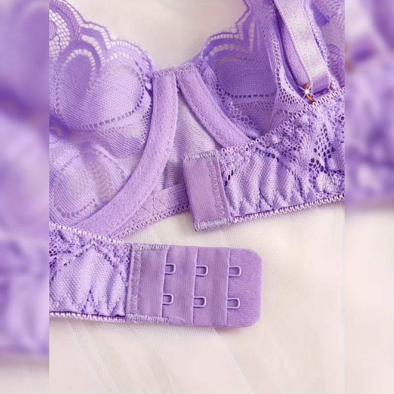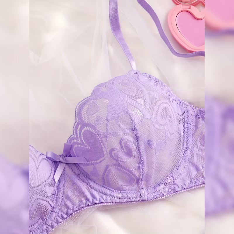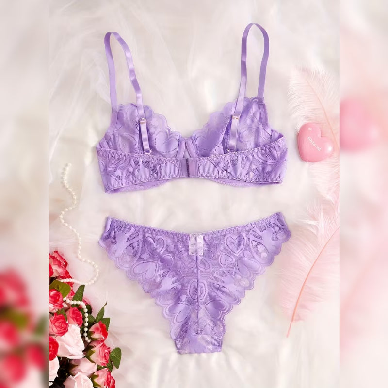 幻想的な紫色が美しい、ハート柄レースのセクシーランジェリーセット。