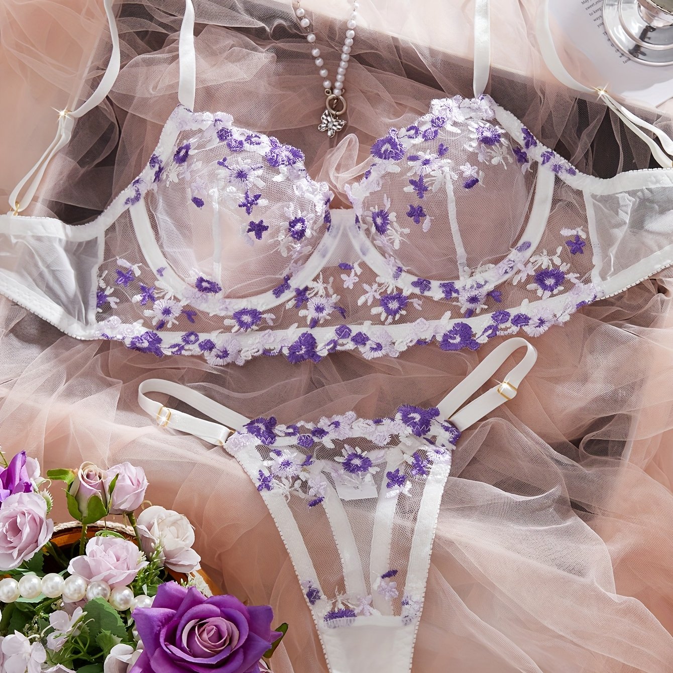 繊細な花柄刺繍を施した、半透明メッシュ素材のセクシーランジェリーセット。軽やかで通気性のある生地が肌に心地よくフィットし、ボディラインを美しく際立たせます。フローラル刺繍がエレガントでフェミニンな印象を与え、ロマンチックな夜や特別なシーンを華やかに彩ります。カップルのナイトウェアやギフトとしても最適。柔らかなストレッチ素材で、快適さと美しさを両立したデザインです。