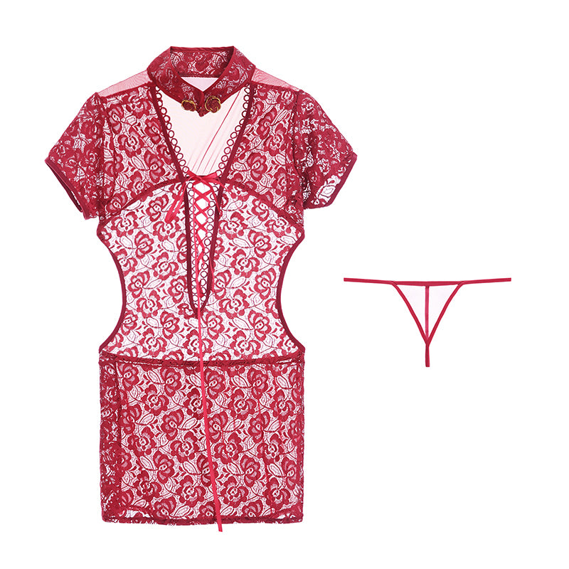 大胆なバックオープンデザインのボディコンとTバックショーツのセット。前面の編み上げデザインがセクシーさを際立たせ、フィット感抜群のストレッチ素材で着心地も快適です。透け感のある生地が女性らしい魅力を引き立てます。