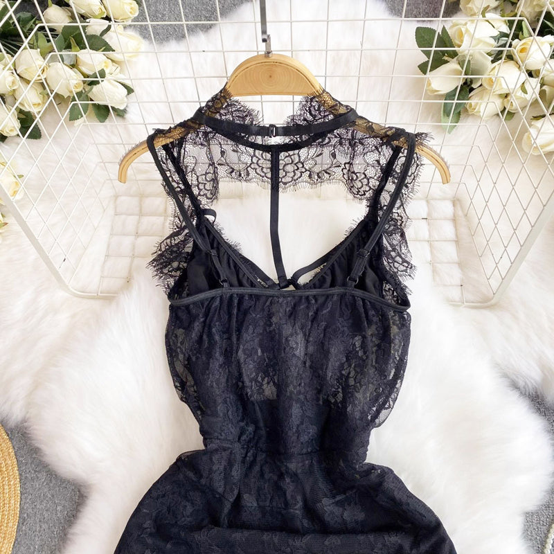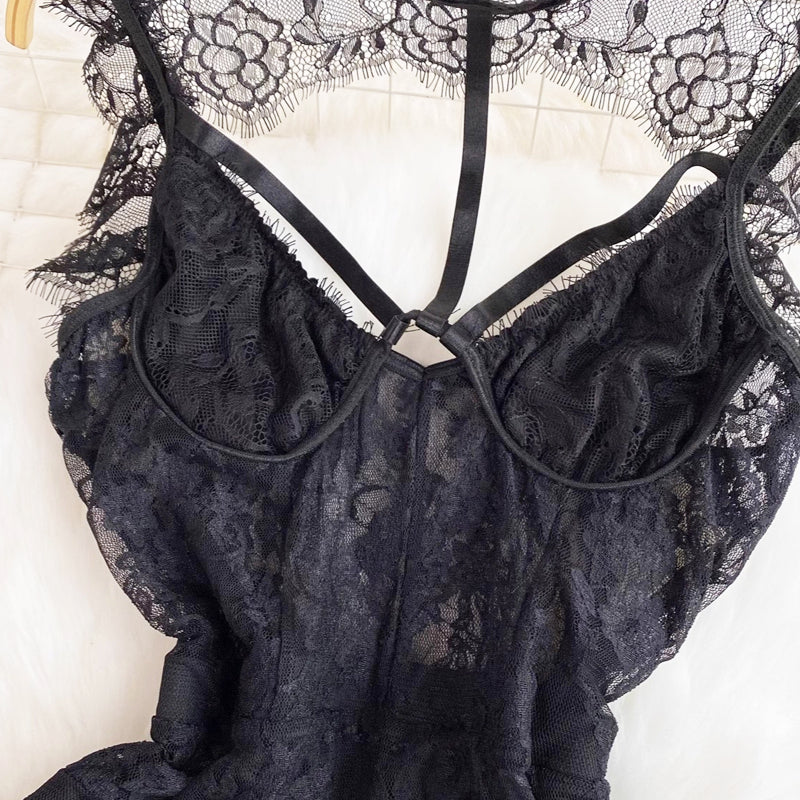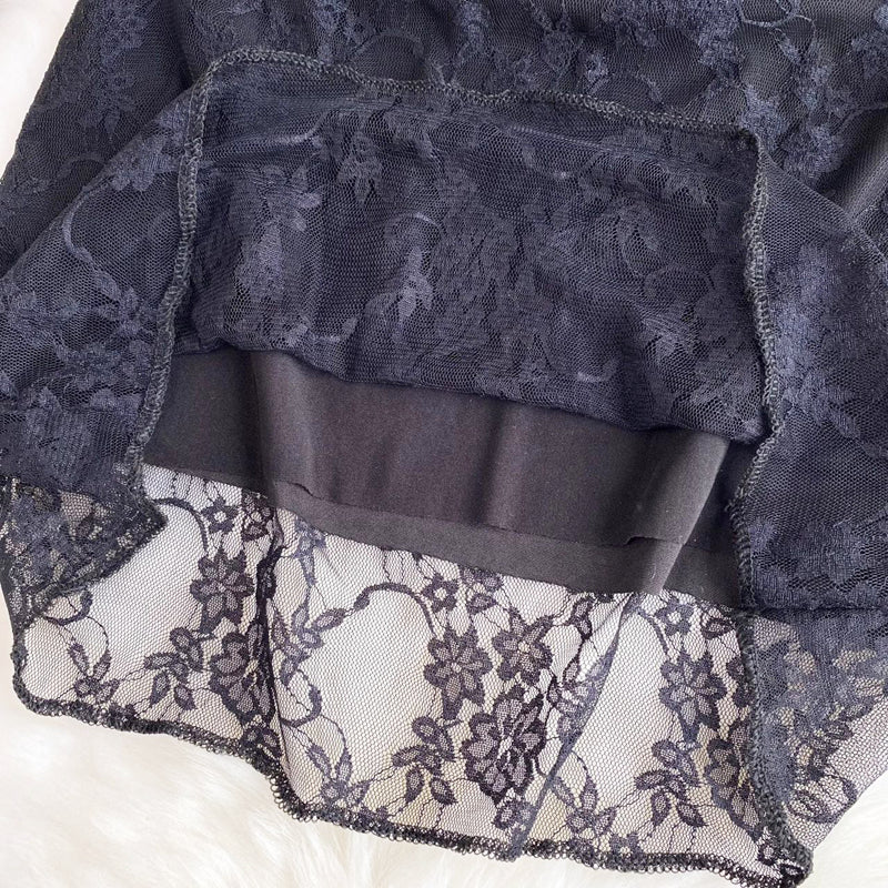 レースとブラック生地のコントラストが美しい、セクシーなボディコンワンピース。胸元とスカート部分には透け感のあるレースを使用し、上品な色気を演出します。首後ろはホック仕様で着脱がスムーズ。肩紐は長さ調節が可能で、ストレッチの効いた生地が身体にぴったりフィットします。Tバック付きで、特別な夜の演出にもぴったりなアイテムです。