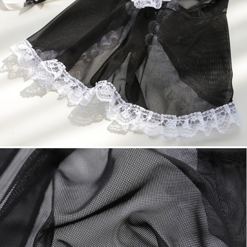 豪華な7点が揃ったメイド風ベビードールとTバックのセット。ひもカチューシャ、首飾り、腕飾り×2、太もも飾りが含まれ、特別なシーンを華やかに演出します。フリーサイズで、総丈は56cm、バストは最大82cm、ウエストは最大78cmまで対応。バック結び紐タイプでサイズ調整が可能です。透け感のあるデザインとストレッチ素材が、快適な着心地を提供します。色はシックなブラックです。