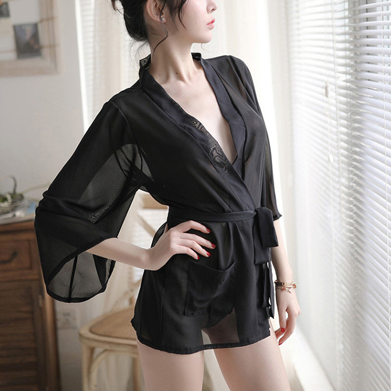 肌触りが良く、軽やかな生地で仕立てられたセクシーなガウンとTバックのセット。ボディラインを引き立てるウエスト紐と前開きデザインが、エレガントで大胆な印象を与えます。特別な瞬間を演出する上品なランジェリーです。