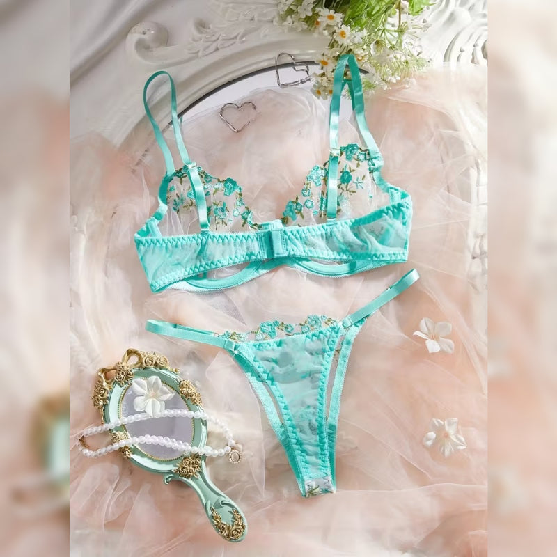 大胆なデザインが魅力の、刺繍入りセクシーランジェリーセット。