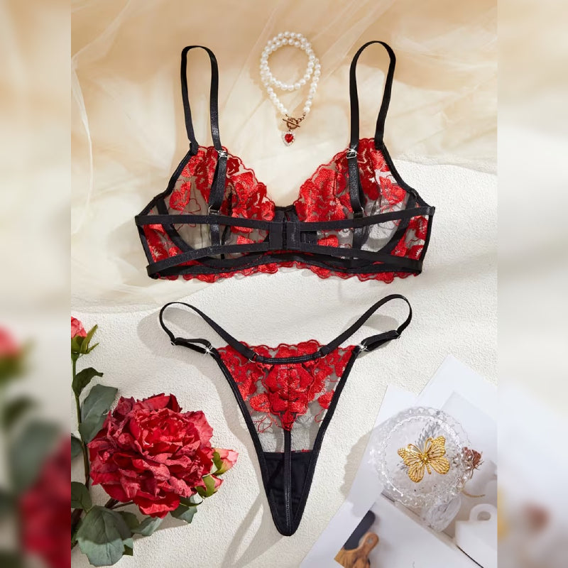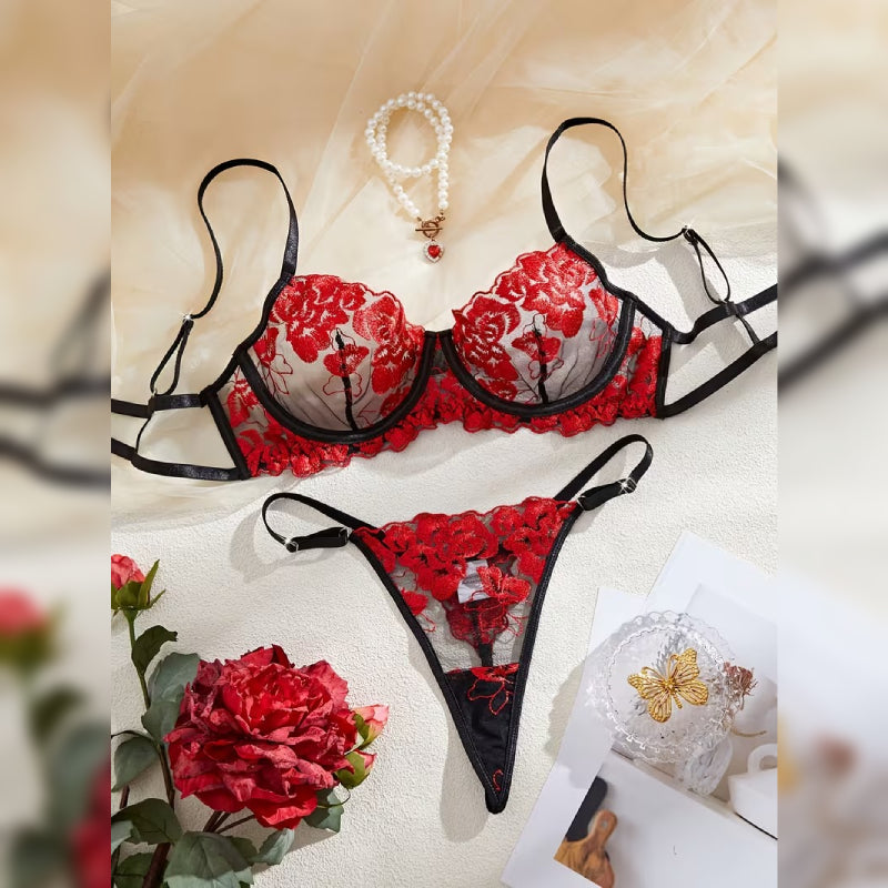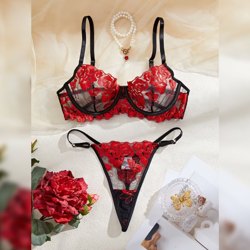 繊細な刺繍が施されたメッシュ素材のブラ&ショーツがセットになったセクシーランジェリー。アンダーワイヤー入りのブラが美しいバストラインをサポートし、セミシアーの透け感が大人の色気を引き立てます。しなやかなストレッチ素材でフィット感にも優れ、肌当たりも快適。バレンタインや特別な夜にぴったりの、エレガントかつ刺激的な一着です。