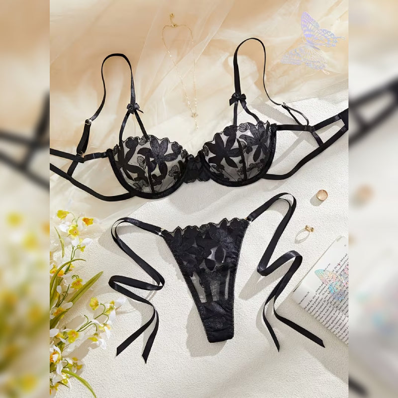 花柄刺繍メッシュオープンクロッチランジェリーセット セミシアーデザイン