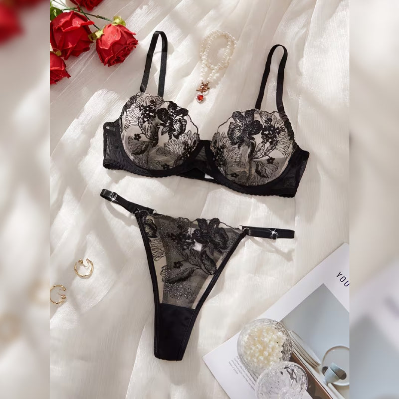 花柄刺繍メッシュブラ&Tバック セクシーランジェリーセット