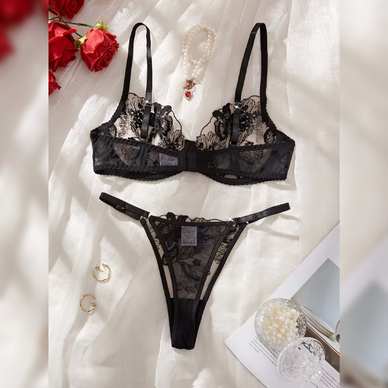 繊細な花柄刺繍があしらわれた、シアーメッシュ素材のブラ&Tバックセット。ブラックの生地に浮かぶ刺繍ディテールが高級感を演出し、セクシーで洗練された印象を与えます。調節可能なストラップ付きで、フィット感を自由に調整可能。セミシアーの透け感が肌を美しく引き立て、ボディラインを艶やかに魅せます。軽やかな着心地のニットメッシュ素材で、快適に着用できる大人のランジェリーです。