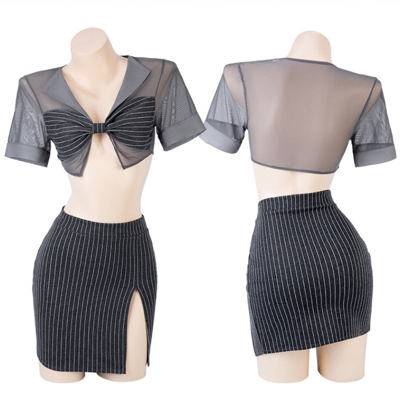 グレーのストライプ柄がクールで上品な印象を与える、オフィスレディ風コスプレ衣装。半袖ブラウスは透け感があり、程よくセクシーな雰囲気を演出。上からかぶる仕様で着脱も簡単です。スカートは透け感のない生地で安心感があり、上下ともストレッチ素材を採用しているため、快適なフィット感を実現。Tバックも付属し、リアルな秘書スタイルを楽しめる一着です。