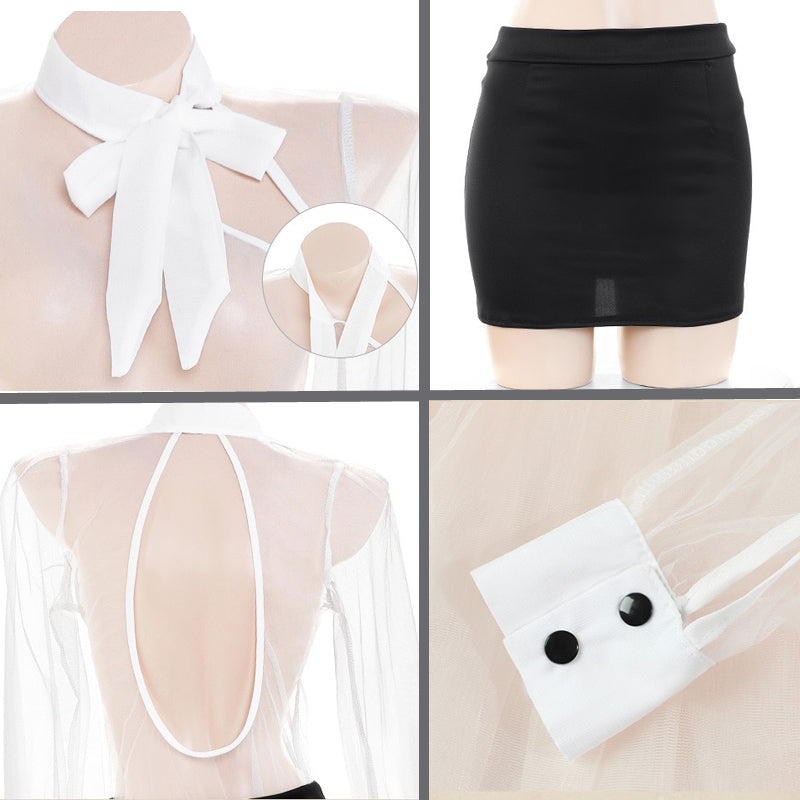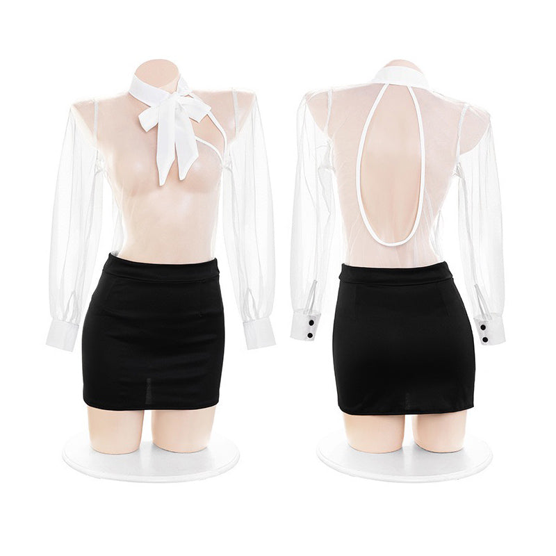 透け感のあるブラウスとタイトスカートを組み合わせた、セクシーなオフィスレディ風コスチューム。ブラウスは首紐で結ぶタイプで、袖口にはボタン仕様を採用。程よい透け感が上品さと色気を兼ね備えた印象を与えます。スカートは短め丈で脚線美を強調し、上下ともストレッチ素材で動きやすく快適な着心地。Tバック付きで、特別な夜やイベントにも映える一着です。