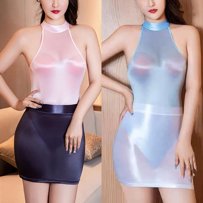 光沢感のあるレオタードとセクシーなミニスカートです。レオタードはバックファスナーで着脱しやすく、クロッチオープンデザインが特徴です。ストレッチ素材で快適にフィットし、特別な日の演出にも最適。スカートは透け感のあるデザインとレザー風素材が選べ、どちらもスタイリッシュに着こなせます。お好みに合わせて、自由に組み合わせを楽しんでください。