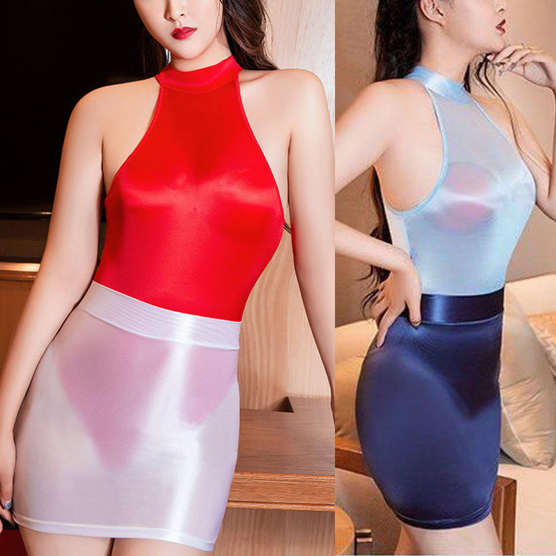 光沢感 レオタード ミニスカート
