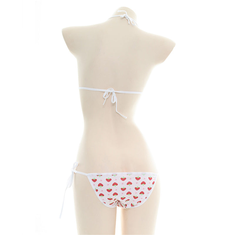 キュートないちご柄と大胆な超極小デザインが魅力的なホルターネックブラセット。ショーツはギリギリラインまでのセクシーなマイクロビキニスタイルで、体のラインを引き立てます。結び紐タイプのブラとショーツで、フィット感を自由に調整可能。軽やかな素材で、夏のビーチやプールサイドで注目を集めるアイテムです。