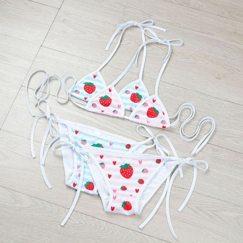 イチゴ柄がキュートなスクール水着風のブラ&ショーツセット。柔らかくつるつるとした肌触りの良い生地を使用し、程よい伸縮性で快適な着心地です。ショーツはサイド結び紐タイプで調整が可能。パッド・ワイヤーはなく、軽やかで自然なシルエットを演出します。すこし透け感があり、遊び心のあるセクシーな印象に仕上がっています。